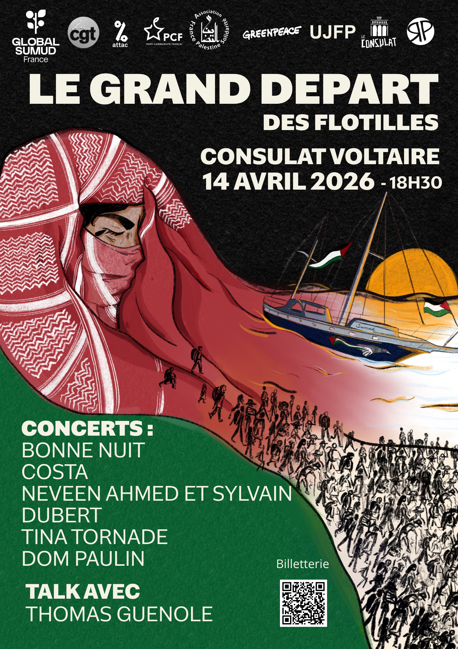 Au programme : concerts avec Bonne Nuit, Costa, Neveen Ahmed & Sylvain, Soad, Tina Tornade et Dom Paulin, un talk avec Thomas Guénolé, des prises de parole et témoignages des organisations impliquées dans la flotille et la lutte pour la Palestine, une exposition « Soyez nos voix », née de la correspondance entre l’illustratrice italienne Marcella Brancaforte et le journaliste Al Hassan Selmi depuis Gaza, un marché solidaire avec vente de merch GSF et d’œuvres d’art au profit de la mission.