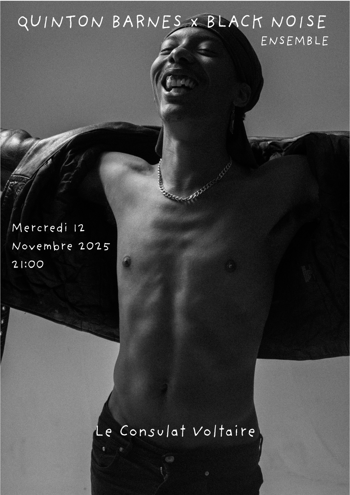 Quinton Barnes, figure montante et audacieuse de la scène montréalaise, dévoile avec Black Noise un projet qui repousse les frontières du hip-hop et des musiques expérimentales. Après avoir bâti depuis 2018 une discographie singulière et totalement autoproduite, l’artiste s’associe pour la première fois au compositeur et producteur Michael Cloud Duguay (Scions), donnant naissance à un album collectif où se rencontrent rap, gospel, funk déconstruit, harsh noise, drone orchestral et improvisation libre.