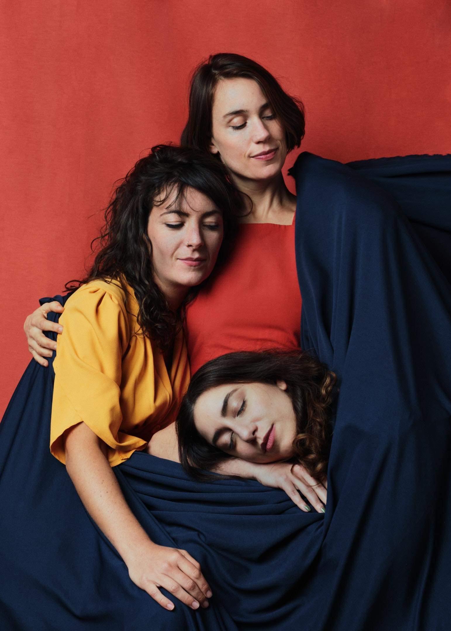 Un trio, une triade plutôt, atypique, frontale, percussive. Détournant en effet les canons du trio féminin, les attendus d’une formation polyphonique, les timbres et personnalités très marquées des trois chanteuses s’ajustent sur le fil pour tisser en plusieurs langues, sur plusieurs rythmes, une étrange matière sonore. Quand ce ne sont pas les voix, ce sont les pieds et les mains qui martèlent, pour nous ancrer en terre et cheviller l’âme au corps, une bonne fois pour toutes.