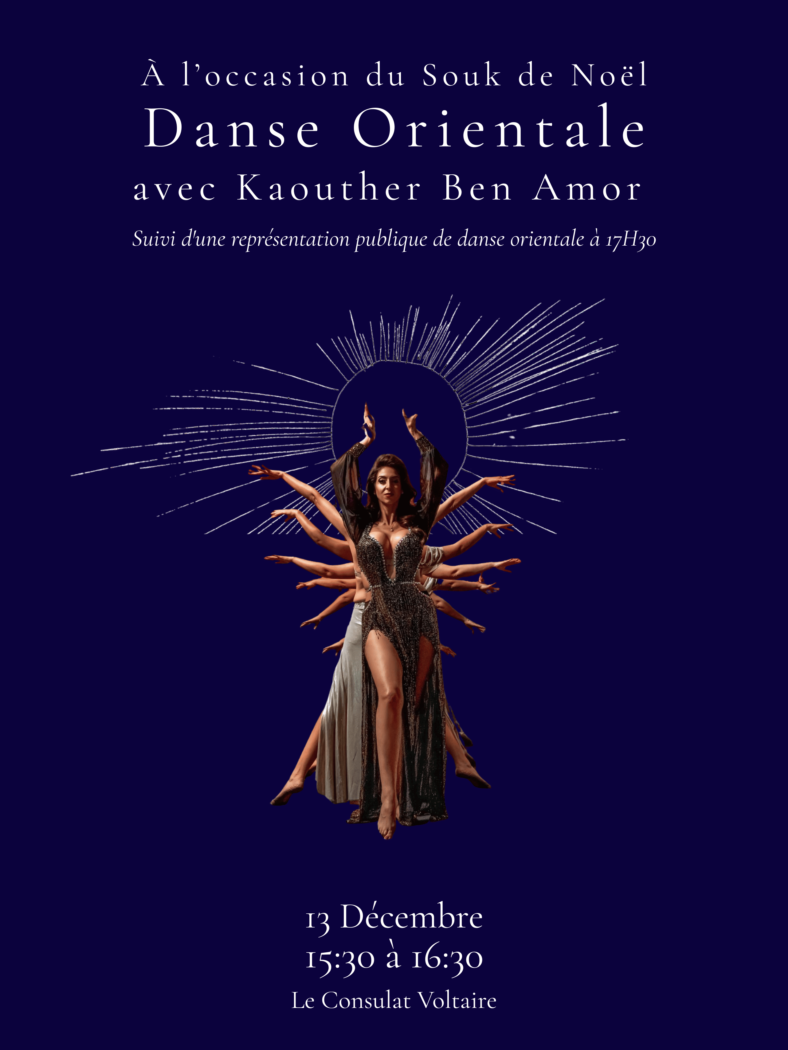 Le cours de danse sera suivi d’un spectacle de danse orientale par les danseuses professionnelles du studio, à 17H30.