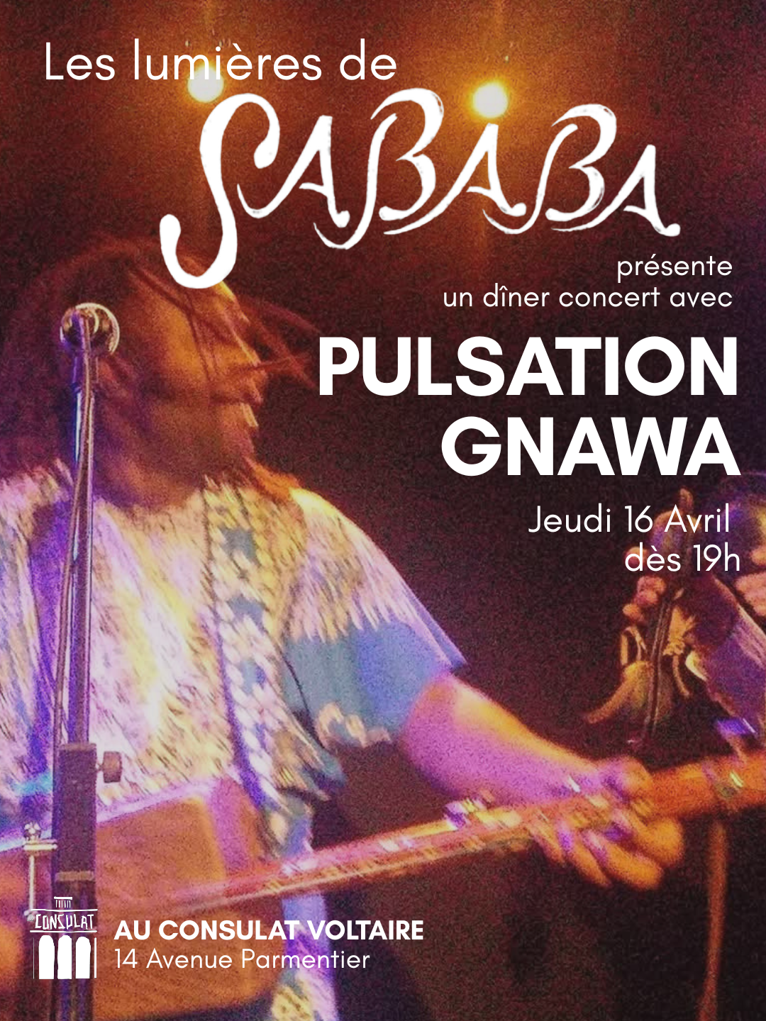 Pour cette soirée, nous vous convions à partager un délicieux repas, suivi d’un concert de musique gnawa avec le groupe Pulsation Gnawa.