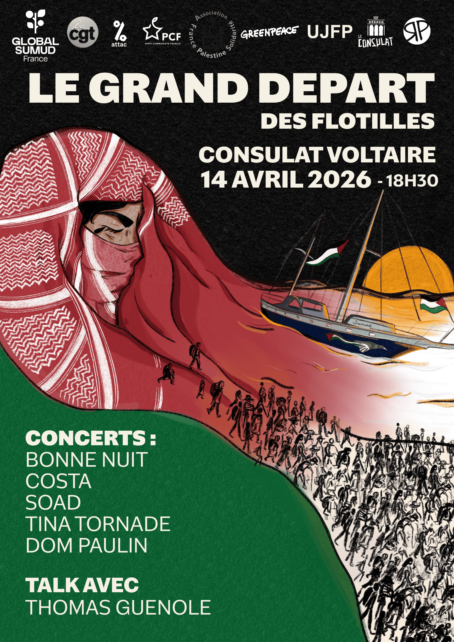 Au programme : concerts avec Bonne Nuit, Costa, Soad, Tina Tornade et Dom Paulin, un talk avec Thomas Guénolé, des prises de parole et témoignages des organisations impliquées dans la flotille et la lutte pour la Palestine, une exposition « Soyez nos voix », née de la correspondance entre l’illustratrice italienne Marcella Brancaforte et le journaliste Al Hassan Selmi depuis Gaza, un marché solidaire avec vente de merch GSF et d’œuvres d’art au profit de la mission.