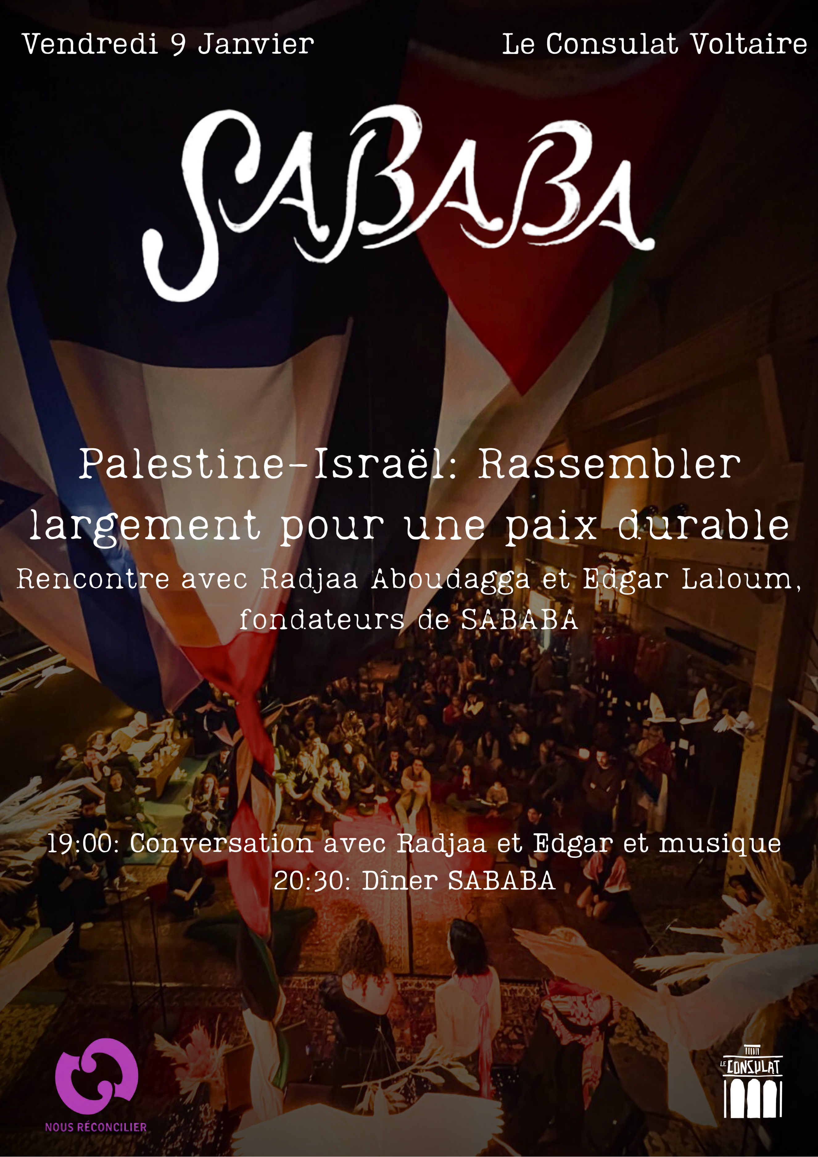 « Palestine – Israël, rassembler largement pour une paix juste et durable » Rencontre au Consulat Voltaire avec Radjaa Aboudagga, franco-palestinien de Gaza et Edgar Laloum, franco-israélien, animée par l’association Nous Réconcilier. La rencontre sera suivie d’un dîner Sababa.