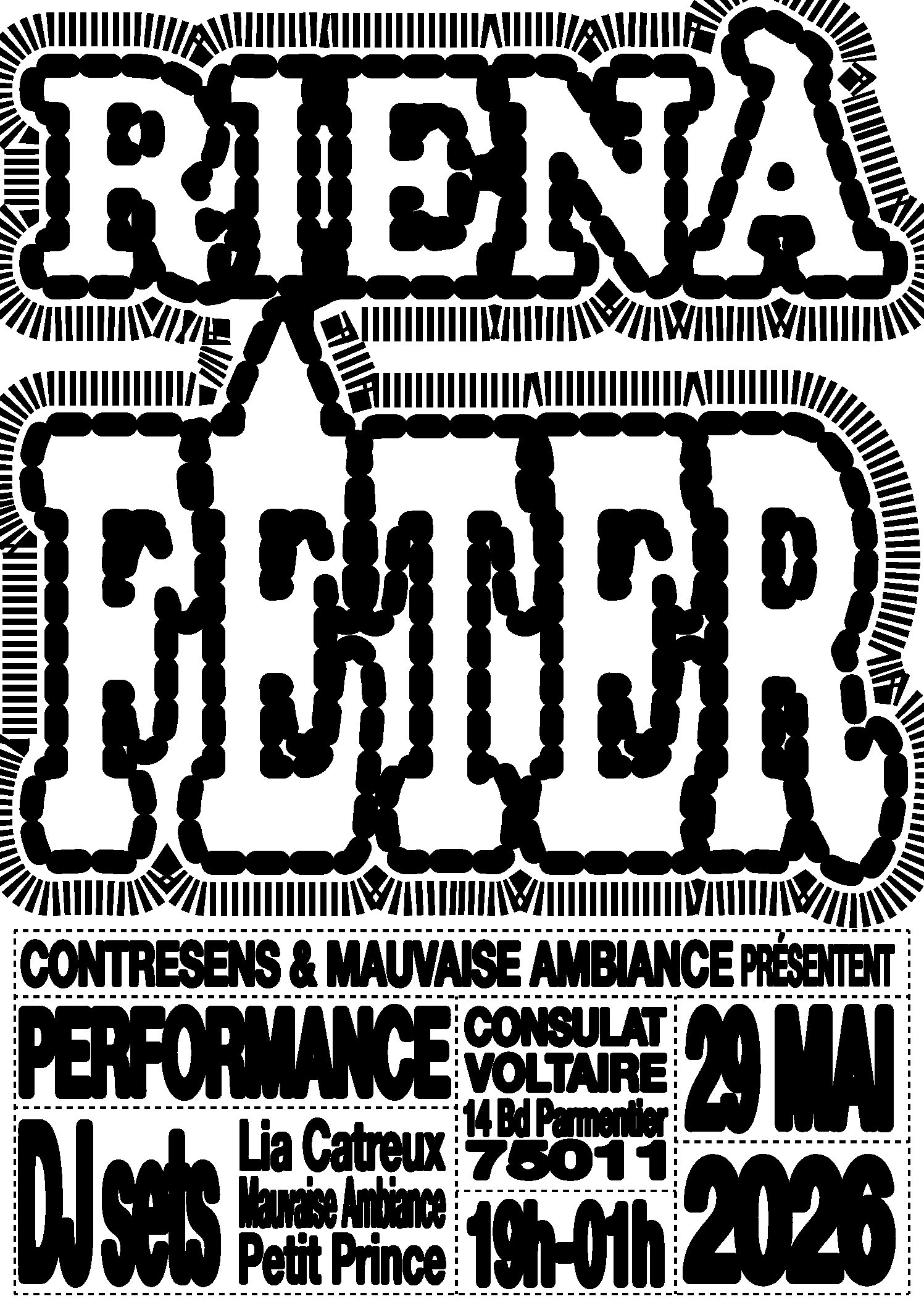 Rien à fêter, un projet signé Angèle Cadiou et Axel Benaben, co-produit par les collectives Contresens et Mauvaise Ambiance : une performance dansée, une expo photo, une édition, des DJ sets. Quatre gestes pour faire de la fête un manifeste.